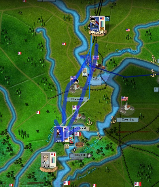 In Western Kentucky and Tennessee, General Pope's Corps has swung around Lee's and Grant's camps, cutting Lee off from his supplies and capturing Decaturville and closing in on Fort Henry and Fort Donelson. This change of base served to put pressure on Forrest's forces in Northern Kentucky as well as giving Lee a number of bad options to pick from. A division of Cavalry under General Walker moved from Fort Henry into Paducah, capturing the garrison of that town at the same time a division of Union Cavalry under General William F. Smith under the command of General Gilbert took Columbus and just missed Walker's force.