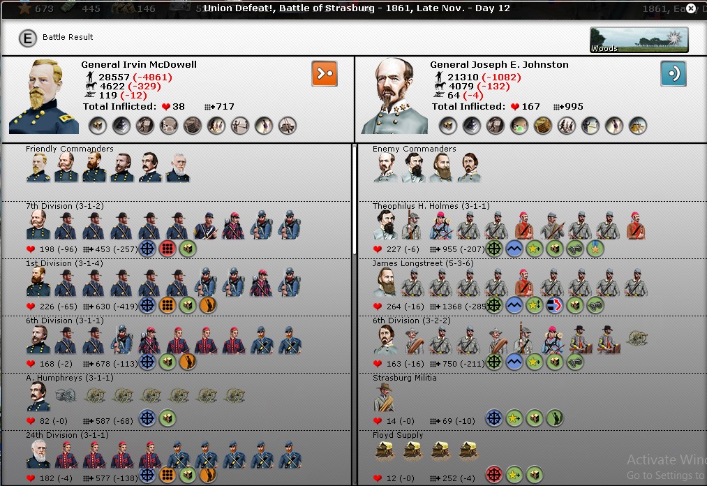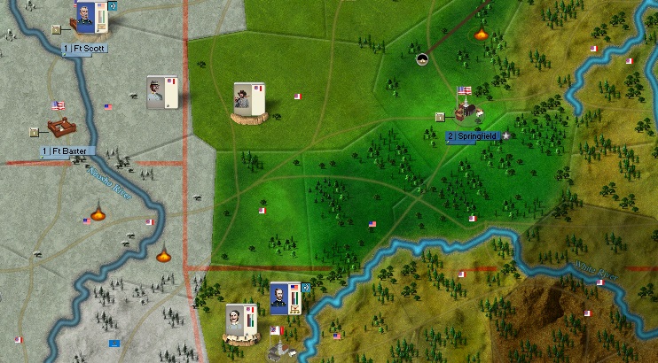 First Bull Run and Wilson's Creek are very hard to replicate. A fast CSA can get to Springfield in force before the Union can arrive (you have to split your forces in Fayetteville). So the Union is almost guaranteed to lose at Springfield and at Manassas. Two early losses like this are fine, but the new retreat rules are confusing to me. When I make these attacks in tests, I lose and end up sitting there. I can usually escape at Manassas, although I am very vulnerable to a strong counterstroke towards the capital. But Wilson's Creek is less developed and thus a slower (and hungrier) retreat. Thus, I only plan to replicate the former.