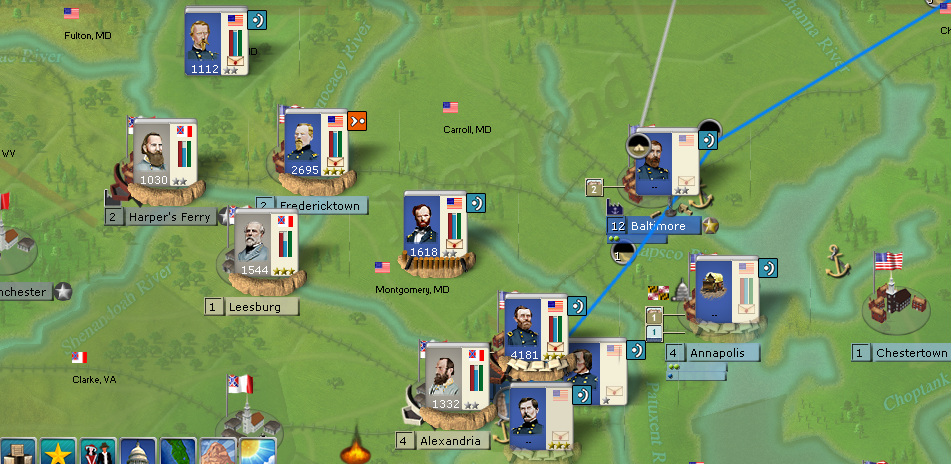 With Winter approaching, I have strategic choices. Grant is Commander of the Army of the Potomac. All corp under him are maxed out, including Grant with a whopping 6 division.