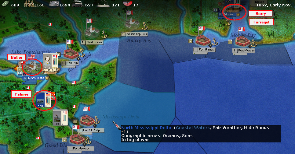 Lots to report. New Orleans is heating up. In a surprise move, Polk has left Tennessee and showed up in New Orleans. There's been a few skirmishes over the months, but with Polk's arrival, the fighting has grown in intensity. Butler is holding firm so far, but he's soon going to get overwhelmed by numbers. Farragut's fleet is in mobile and ready to transport. Palmer and 2 Ironclads came down to support Farragut and sure enough the Manassas is parked off New Orleans.