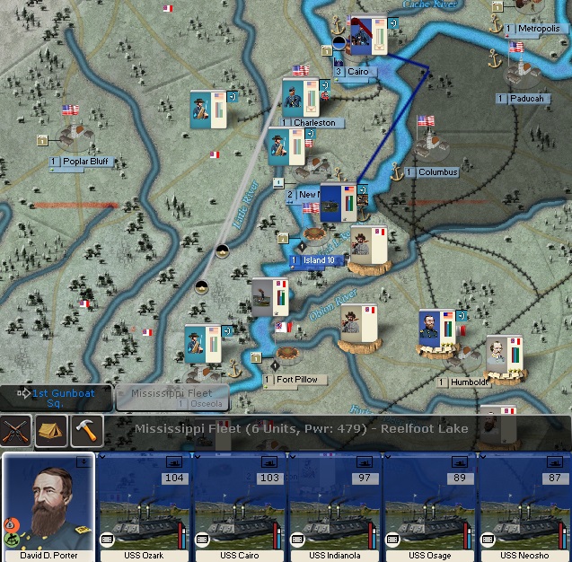 Nathaniel Lyon became famous with his securing of central Missouri. Asboth having secured Jefferson City and loyal militia securing Rolla (where the confederates had burned the depot in a militia-led raid), Lyon began gathering forces in Camden County between Springfield and Jefferson City [incorrectly called Erie in the game, I don't know of any Erie Missouri between Springfield and Jefferson City]. Those forces were waiting the arrival of supply wagons as well as the establishment of depots, which were being built along the Missouri in Jefferson City and Leavenworth, Kansas as well as in Parkersburg, WV. Encamped with about 6,000 men, Lyon was personally accompanied by a brigade of Kansas Mounted Volunteers with General Morrell heading the 2nd Missouri Brigade and General Wood heading a brigade of Western Volunteers. General Shelby led a force of nearly 10,000 including his own accompaniment by a brigade of Missouri Cavalry, and Weightman's Brigade (now under General Thomas) and Bowen's Brigade (now under General Whiting). Morrell's Missouri Brigade performed especially well against an attack by Bowen's (Whiting's) Brigade and one regiment of confederate Missouri militia charged into Lyon's Cavalry but was entirely wiped out through casualty and desertion (no prisoners were captured on either side) when they met a regiment of regular infantry. This battle occurred on July 10.