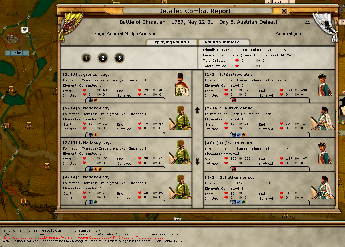 This level uses low level (one star) leader-models of the vanilla game with all their implications. Leaders of this kind always represent colonels in Silesia Inrupta. They work just like in the vanilla game, generating Command Points for troops and using their strategic/offensive/defensive skill. They generate enough command points to lead a regiment (made up of 2 battalions, each of 5 elements). I don't think that there will be brigades (combined units) in Silesia Inrupta. Instead, a single stack represents a brigade. The command-point-limit per stack will be set accordingly (to allow ca. 4 battalions per stack at maximum). Note that the number of leaders determines how many operational detachments you can form. Only forces that are in a region with a leader have their retreat-will modified by the ROE/stance of the leader.