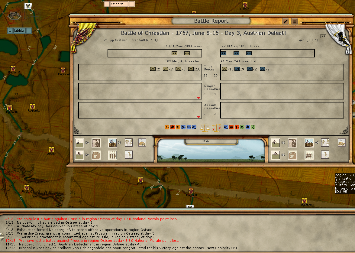 Here, Silesia Inrupta differs a lot. The general-level of command is not represented by leader-modifications on movement and combat, but rather via information. In Silesia Inrupta, you won't be able to spot enemy stacks UNLESS 1) they are fighting your troops (in which case you can see the opposing force in the battle report) or 2) your general have gathered information. The general-level works via general-models (always 1 general for each faction in a scenario; the general-unit represents the player himself) that spawn couriers/information: