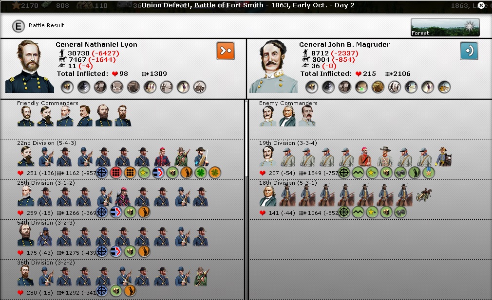 Gray Fox wrote:Lee did everything right and still lost. Nice work by Kearny. Each stack seems to have Divisions led by the usual 3-1-1's with one or two Divisions led by better commanders. If you took all of the better commanded Divisions and put them in one stack together with Kearny or Grant in overall command...