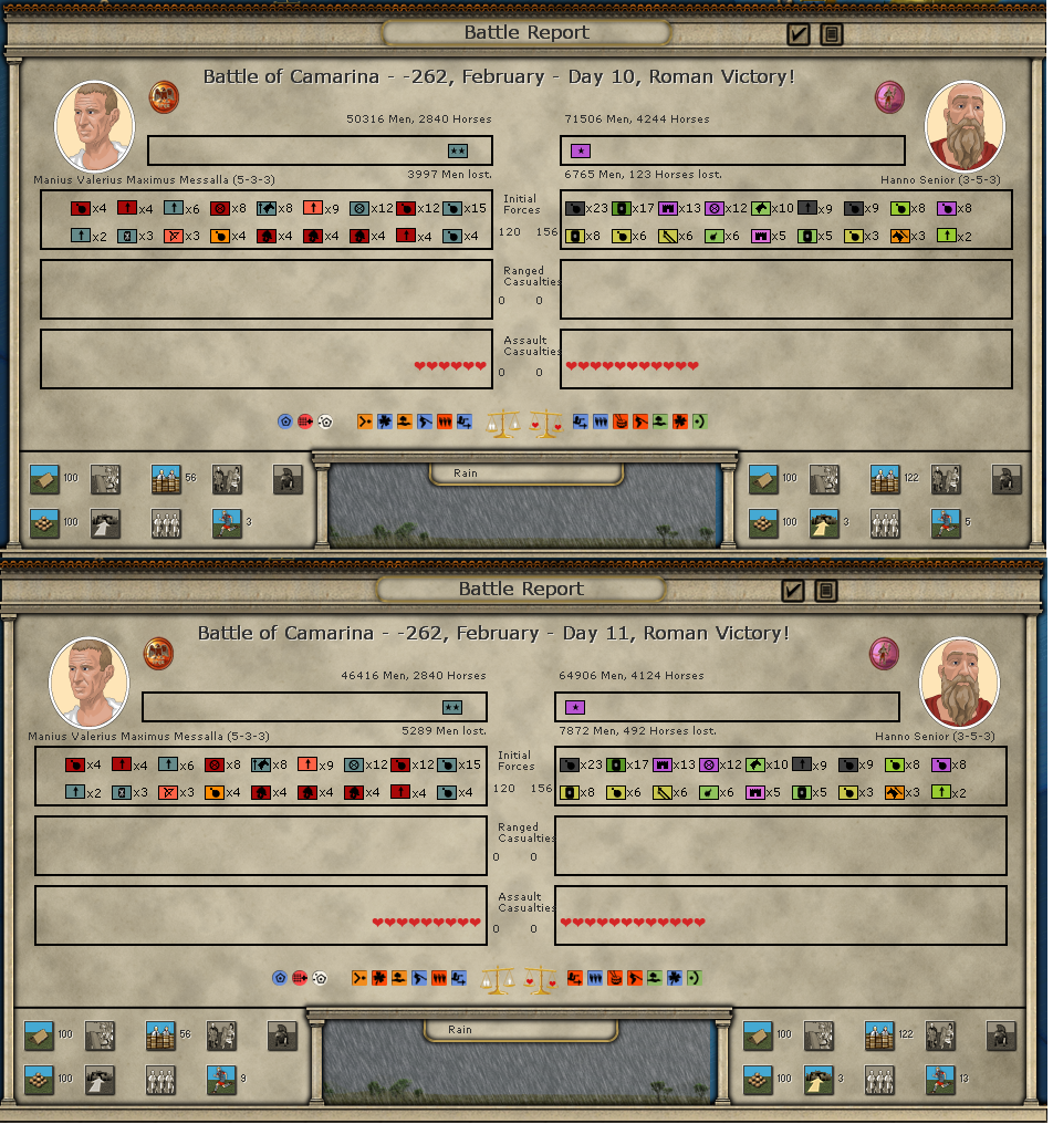 So in the end it looks like I did push my luck. And I suffered the consequence. I was a victim of my own success. I suffered pretty devastating losses across the space of two battles in Camarina. From viewing the replay it looked like Stratego was in the process of attacking into Syracuse. Their field of battle was in Camarina.(In hindsight it would have been much more beneficial for me to hold tough in Syracusae and let the Carthage attack activate Hiero's army.)