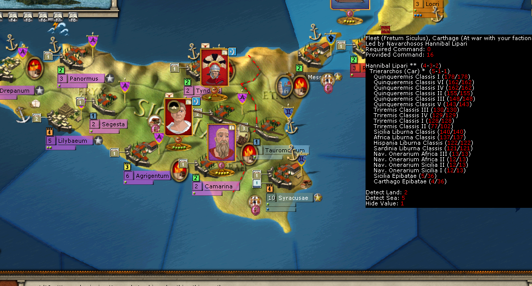 I haven't seen the Carthage navy. The seas have been fairly rough these past few months so have also kept mine sheltered between Ostia and Neapolis. I have to split my navy now because no one port is able to support it in one stack! Hanno Senior has moved forward and taken up a defensive position in Agrigentum.