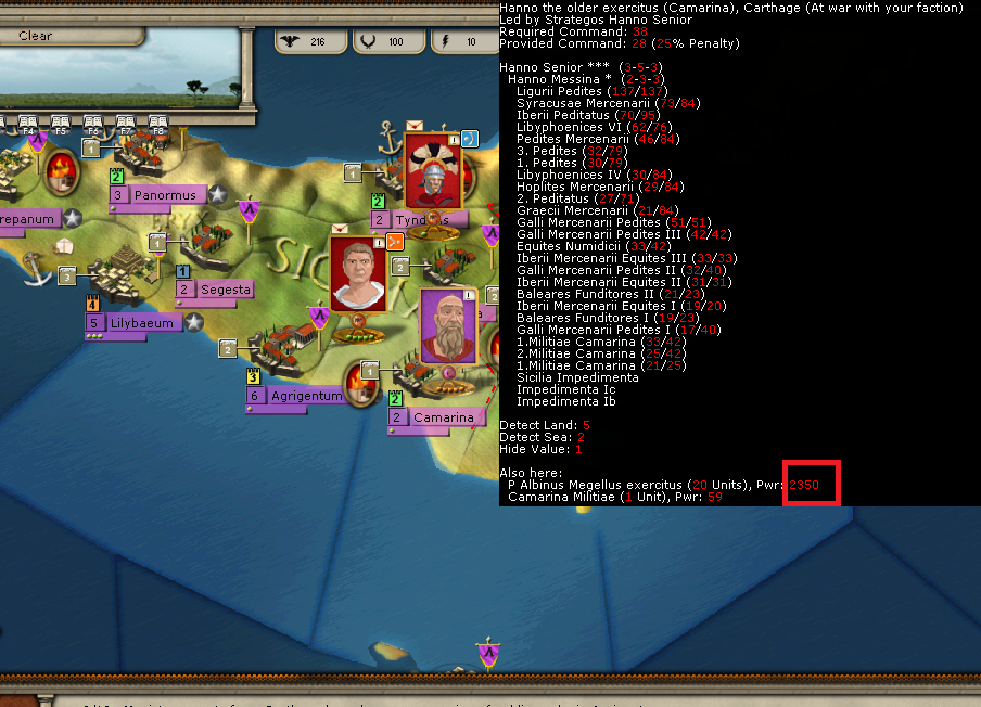 Hiero and his armies quick recovery has allowed me to send on the majority of it to merge with Lucius. This will give me a stack in Camarina of about 2500. All the units within it will nearly be at full strength. The vanguard will be made up of two legions and a unit of Syracusan Hoplites. They alone have a pwr value of are nearly 700.