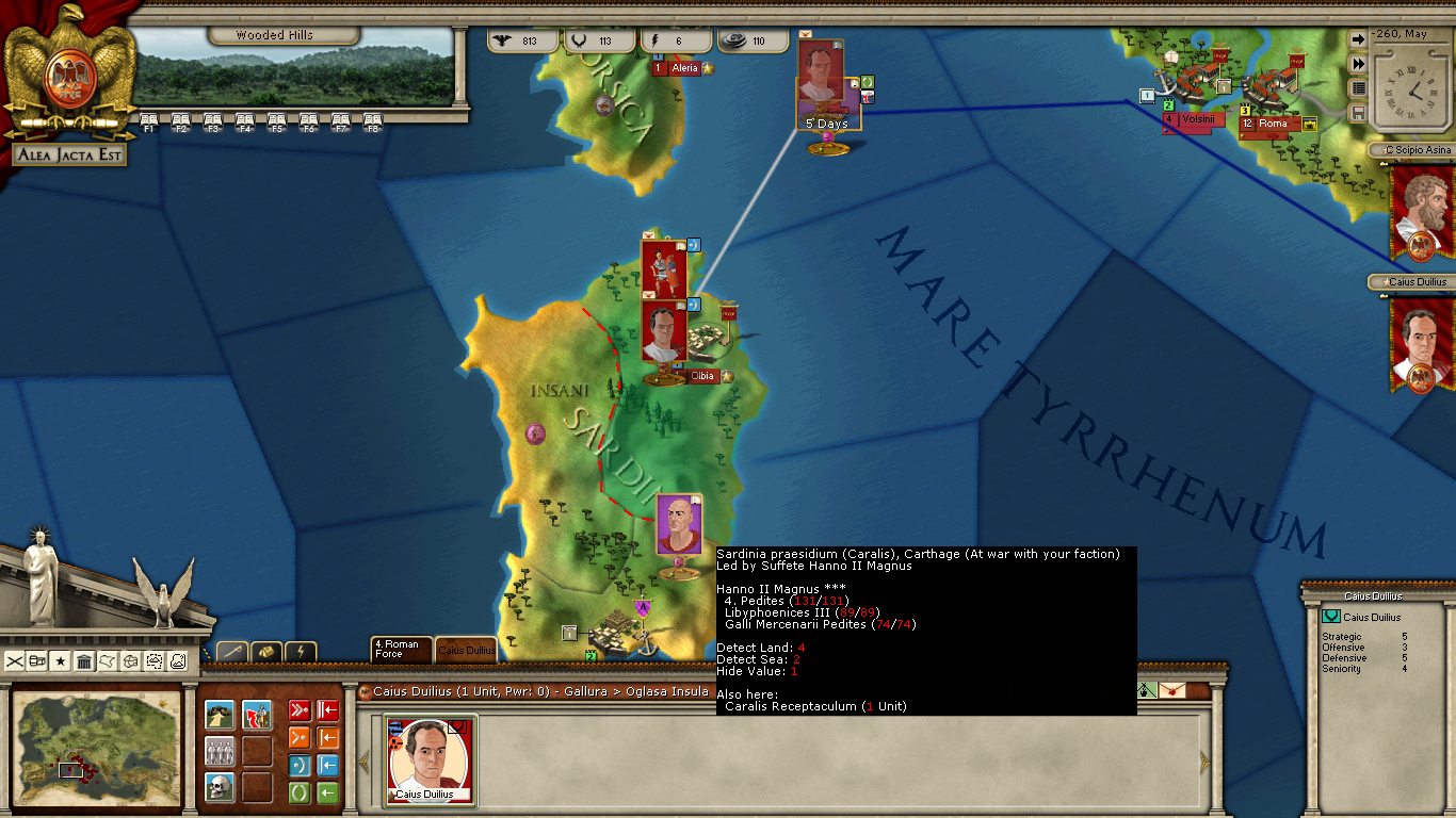 Hiero has managed to get himself drunk as a skunk and is now incapable of carrying out any orders (Locked). Titus will assault Olbia and my two fleets will merge in the sea adjacent to Ostia. The Last time Carthage sent their fleet to intercept it arrived via the West coast of Italy. We will see.