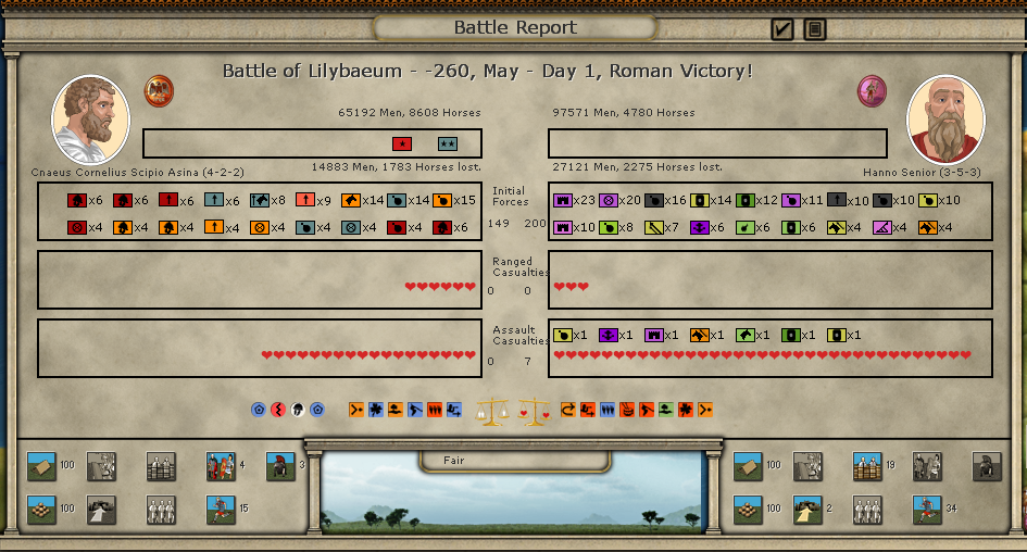 Lilybaeum still stands but Siege is in effect. Carthage fleet has returned to North Africa. And Scipio decimated Hannos army.