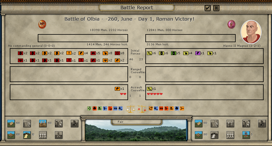 Both Hiero and Titus won their respective battles. I underestimated the opposition in Caralis but Titus still performed pretty well.
