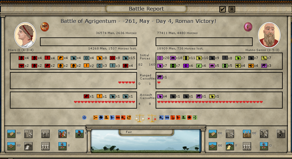 Both Hiero and Titus won their respective battles. I underestimated the opposition in Caralis but Titus still performed pretty well.