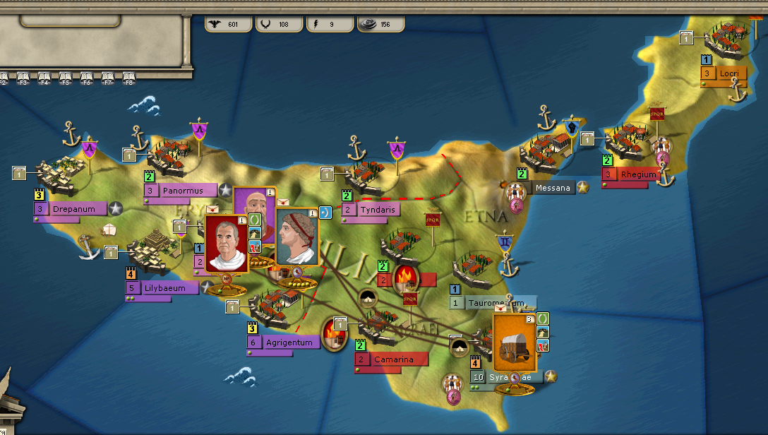 A surprisingly quiet turn. No battles. Little movement, except for the appearance of the Carthage fleet off Lilybeaum. Lilybeaum is still blockaded and besieged. I think the Carthaginians may have been attempting to intimidate us into abandoning the blockade. Fortunately (or maybe unfortunately) Duilius stood his ground. Hanno and Scipio stare at each other across the battle field as their troops sharpen their swords.