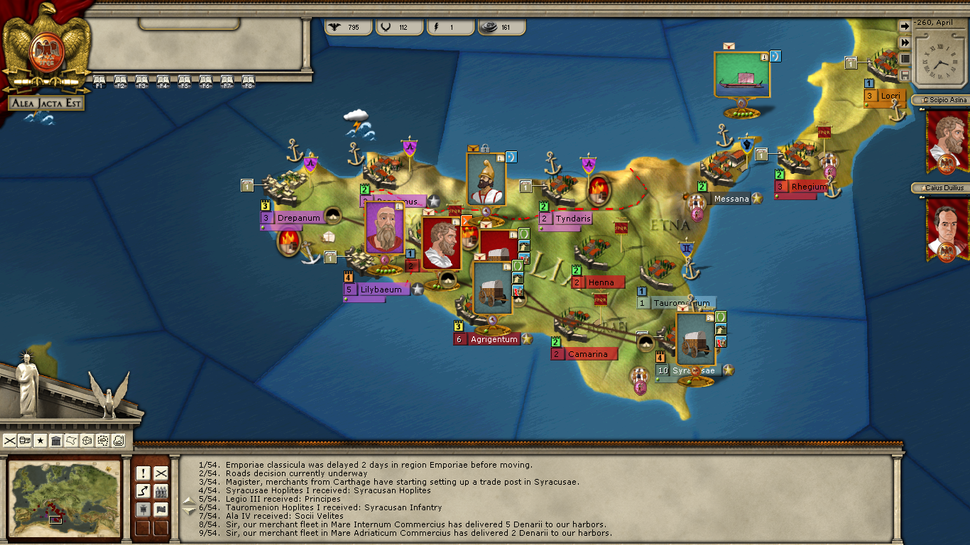 Hiero has managed to get himself drunk as a skunk and is now incapable of carrying out any orders (Locked). Titus will assault Olbia and my two fleets will merge in the sea adjacent to Ostia. The Last time Carthage sent their fleet to intercept it arrived via the West coast of Italy. We will see.