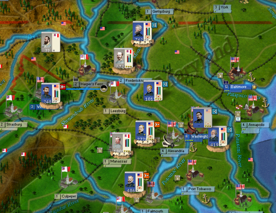The East has come alive. Last turn, John pushed Joseph Johnson into Leesburg with a couple of divisions. I wasn't sure what he was going to do with that force. I was worried about both Jackson with a single division in Harpers Ferry and Johnson's force combining in Fredericktown against Milroy. I took a chance on that because I had Hamilton and a single division in Morgan, WV, flanking Jackson's force and figured he wouldn't take a chance of begin cutoff.