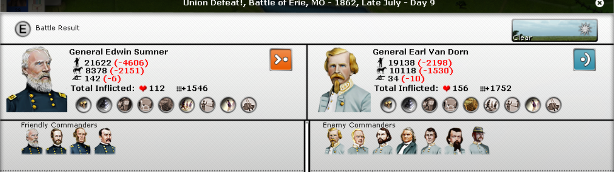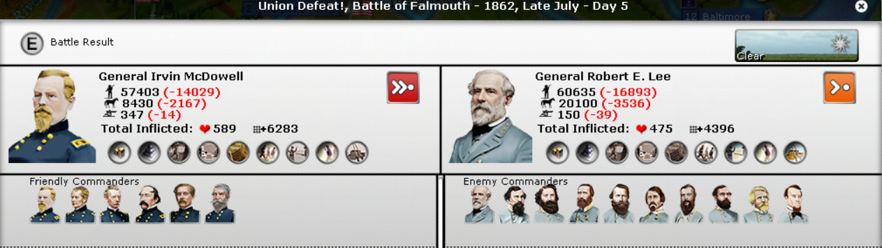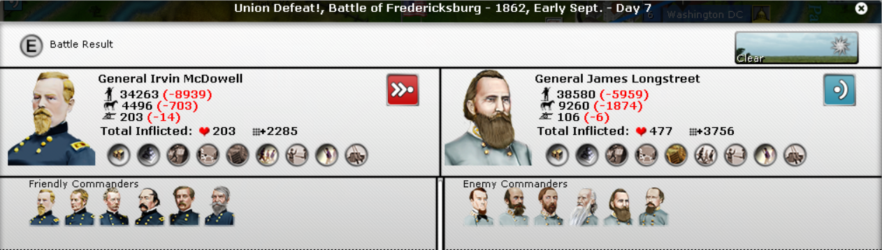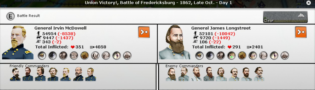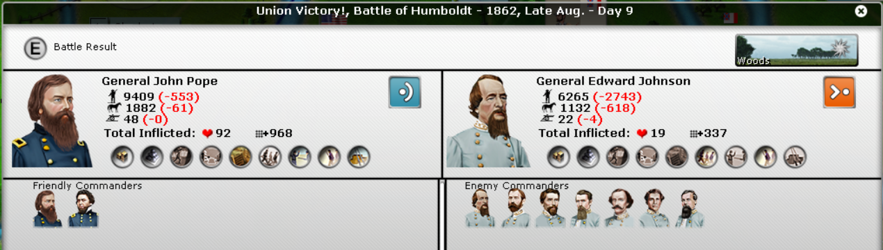 In the East, another Union victory by McDowell. Johnson had 2 victories and become Super-Johnson. McDowell hasn't done anything yet in terms of experience. Butler's 2 divisions were smashed.