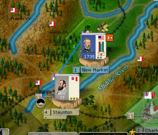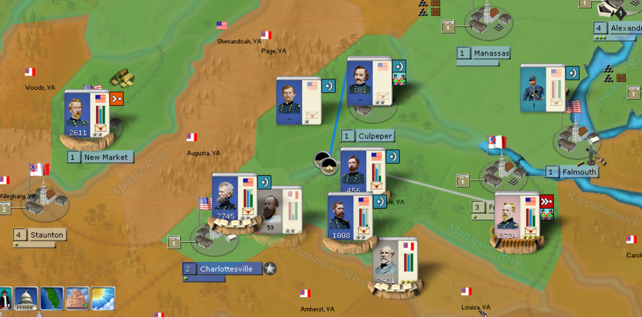 We'll see of the CSA complies. My goal in the East is to hold the line from Harpers Ferry down to Alexandria. For me this is a critical objective. If the CSA is able to get that line (3 regions), the Potomac enables mutually supportive corp to easily defend that line and the CSA can start pulling divisions off the line for use elsewhere. If the USA can hold that line, then the CSA has a much larger swath of land to defend. From Falmouth, Manassas dwon to Winchester must be held. 5 regions vs. 3. A very big difference and the USA can play small ball and start moving corps into the open regions in order to force either CSA response or a pull back. This is the difference between holding the strategic initiative vs. losing the strategic initiative and pure defense.
