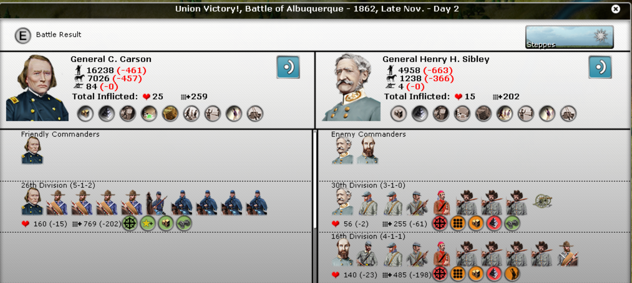 And in New Mexico, Rebel and Union forces have been battling from El Paso up to Sante Fe. Carson has finally gotten the upper hand. The Union has taken El Paso, so Silby's supply has got to be an issue.