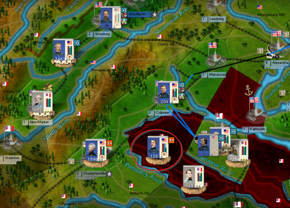 We'll see of the CSA complies. My goal in the East is to hold the line from Harpers Ferry down to Alexandria. For me this is a critical objective. If the CSA is able to get that line (3 regions), the Potomac enables mutually supportive corp to easily defend that line and the CSA can start pulling divisions off the line for use elsewhere. If the USA can hold that line, then the CSA has a much larger swath of land to defend. From Falmouth, Manassas dwon to Winchester must be held. 5 regions vs. 3. A very big difference and the USA can play small ball and start moving corps into the open regions in order to force either CSA response or a pull back. This is the difference between holding the strategic initiative vs. losing the strategic initiative and pure defense.