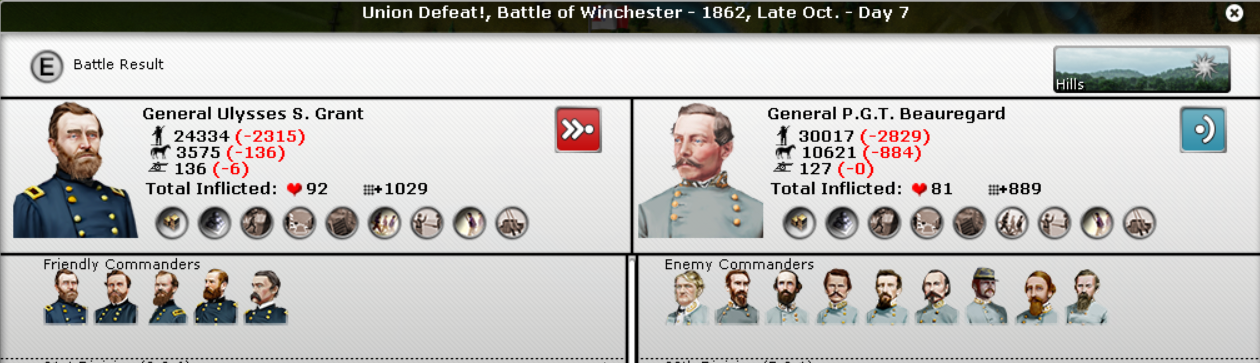 Grant pushed out of Donnelson towards Nashville and engaged Beauregard. This is Grant's 4th victory of the war. In my first game with John, Grant invaded Jefferson City and was immediately promoted. In this game, nothing. The way experience works is really a mystery to me.