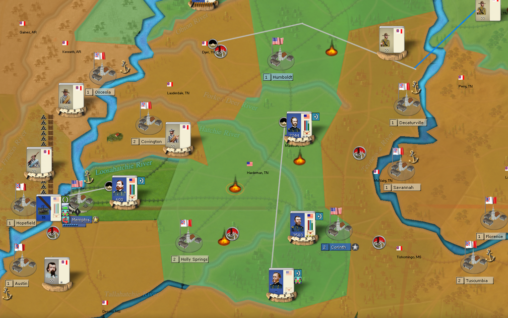 Cardinal Ape wrote:Yes, if you give up Donelson and Nashville then Corinth becomes the likely next target. However, if your defense is centered around Memphis, you could have a corps in both Memphis and Corinth, with an army between them in Hardeman, supporting both regions.