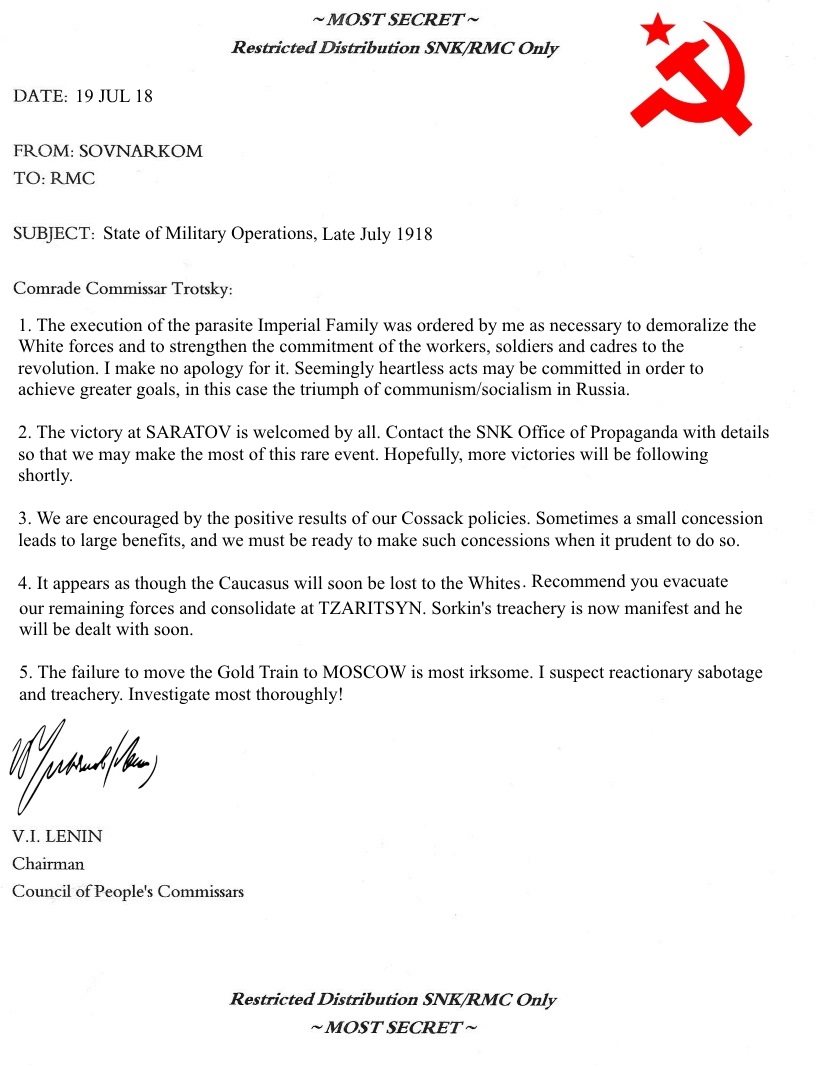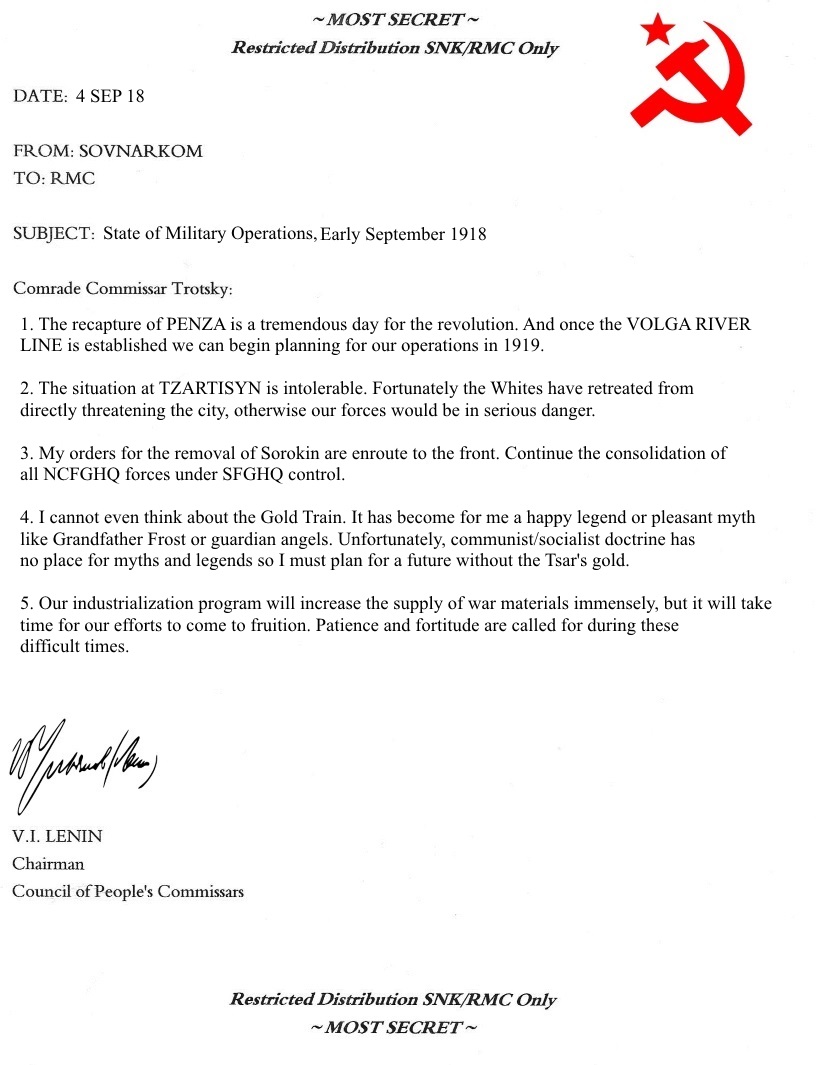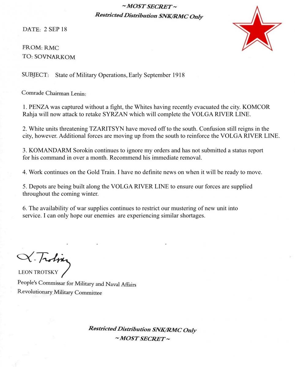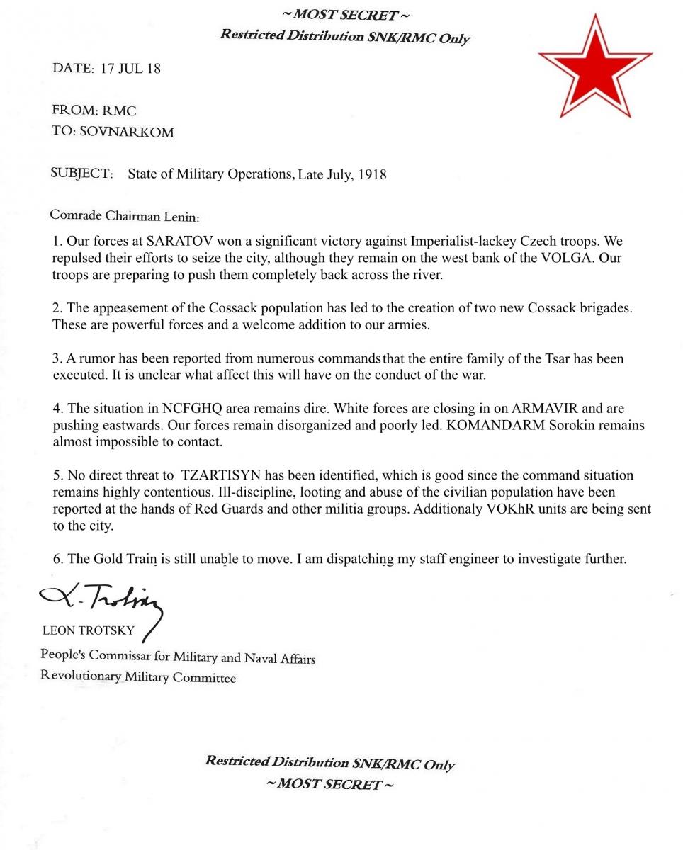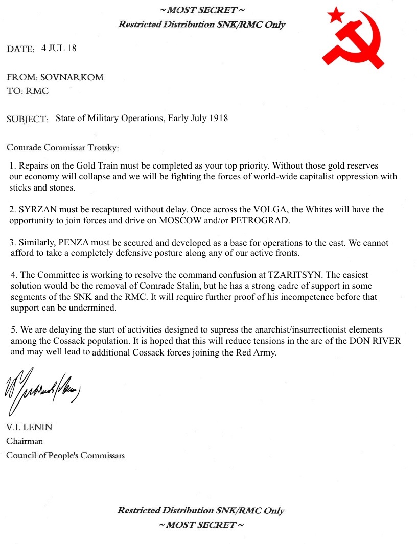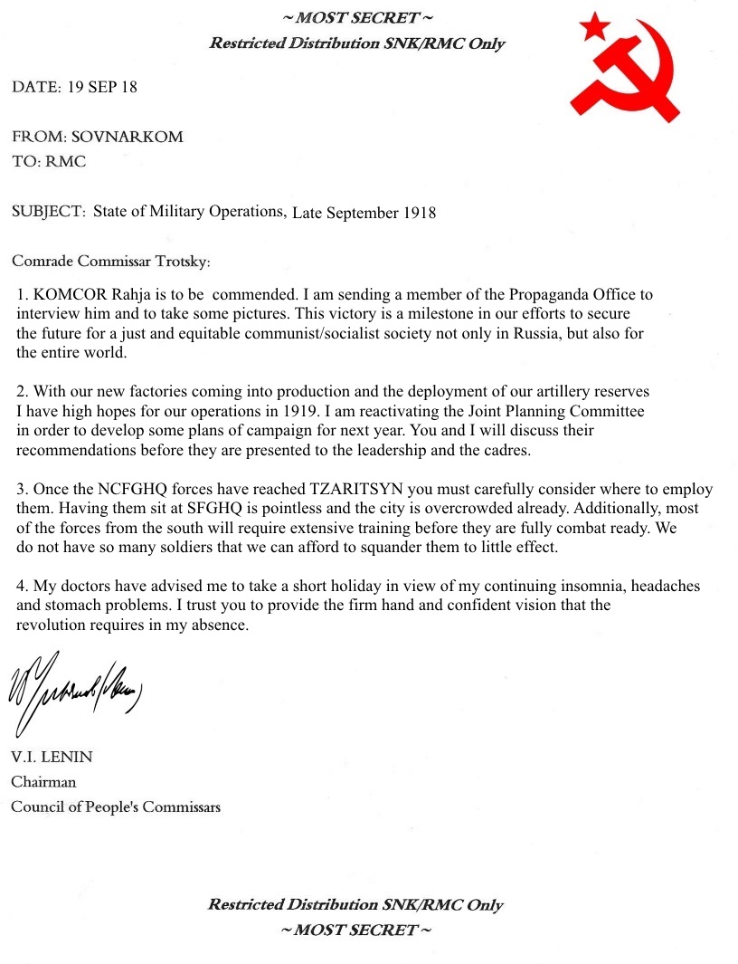Beset by enemies on every side (and, quite frankly, surprised to actually be in charge of a major country after decades of discussion, debate and theorizing...) the Bolsheviks are overwhelmed and unable to develop a coherent strategy as the country slides into chaos and war in the spring of 1918. The two major executive bodies of the revolution - The Council of People's Commissars (Russian abbreviation SOVNARKOM, or SNK) chaired by V.I. Lenin, and the Revolutionary Military Committee (RMC) chaired by Leon Trotsky create a Joint Planning Commission to review the situation and come up with some guidance for the upcoming struggle. After weeks of deliberation and study the committee provides the following recommendations: