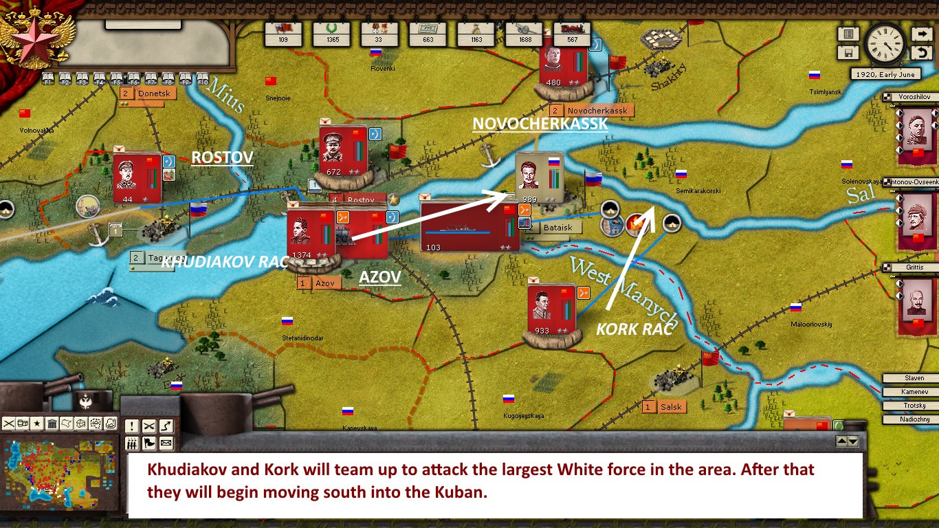 In other actions, division-sized units (without commanders - none are available) are being deployed to the EFGHQ to serve as strong garrison units so that RACs may begin offensive operations across the Volga River. Captured White artillery will be allocated to all RACs to fill units to full command point potential.