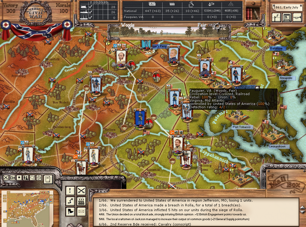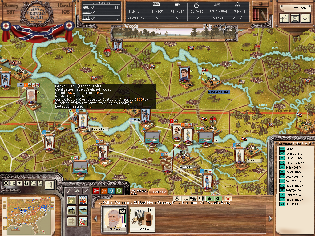 But still, an assault force of one or two strong divisions, Farragut with a decent fleet for support and a bunch of Militia to leave behind as garrisons while the main force continues "harbor hopping" should give Jeff Davis a headache, just like those meddlesome gray raiders behind the union lines give it to Abe Lincoln...