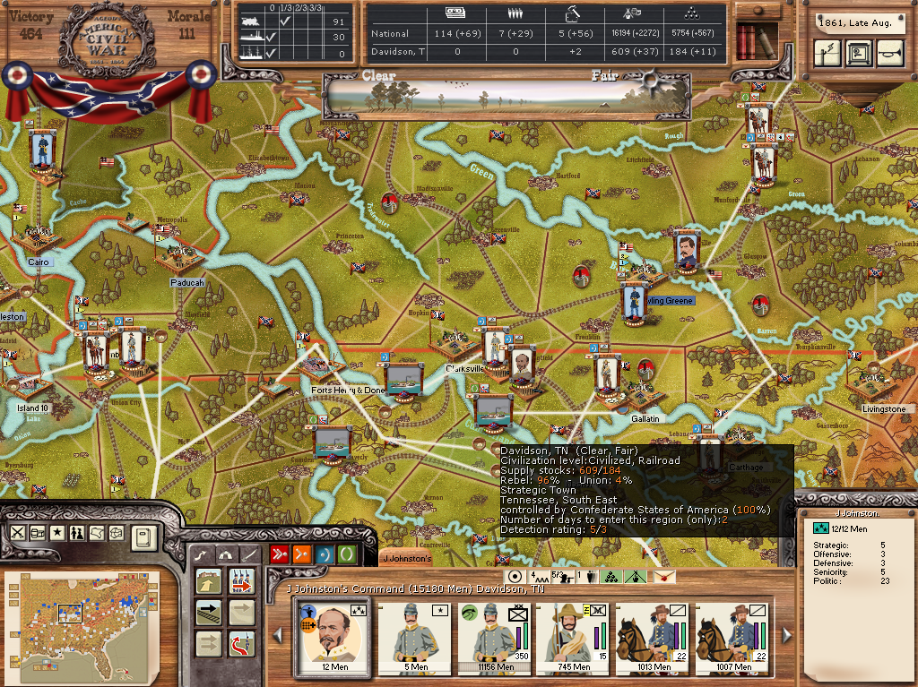 A question: has Jagger tried to do any serious amphibious assaults yet, apart form the failed incursion in Louisiana? If not, that's IMH(and not yet too well informed and mainly based on past experience with other ACW-games)O a severe sin of omission on his part. Many of the east coast harbors should be easy and relatively quickly to reach meat, and even if he defends them only with small militia garrisons while moving on with his main force and loses some of them to counter-attacks, in the meanwhile he'd distract valuable CSA forces from the main theatres and boost his own blockade-efficiency, wouldn't he?
