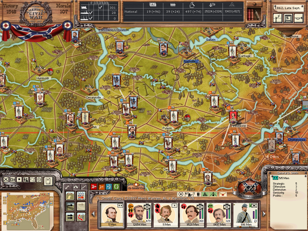 Next turn, he will surely move on either Nashville or Donelson, probably Nashville. With my inexperience, I am not sure how to handle multiple Corps, but here goes with the strategy:
