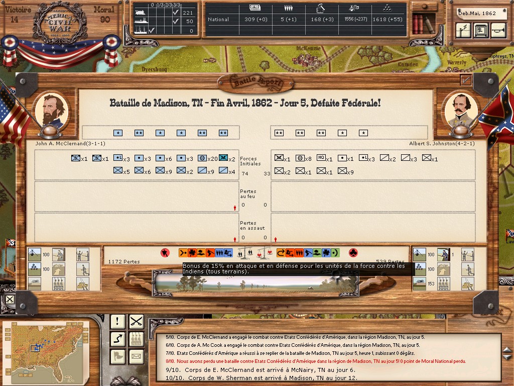 Pour la capture de Madison c'est ultra simple. Dans le rapport du tour tu vois que le joueur confédéré à reussi sa retraite. D'où d'ailleurs le faible montant des pertes.