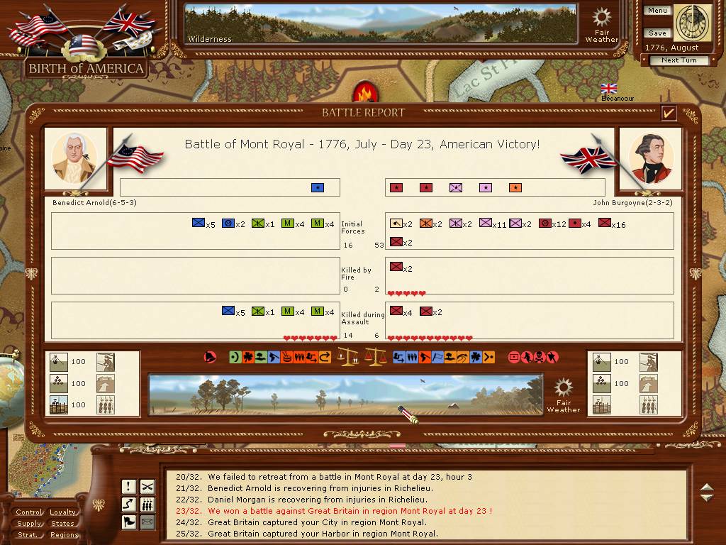 I lost 14 of 16 units, Benedict Arnold was injured, and I lost the city and was moved out of the region.