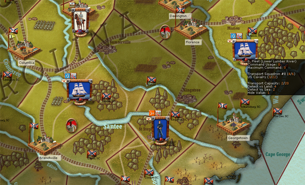 The USS Theodore and Barbarian, with the 2nd Naval brigade aboard (2nd Naval regiment, 3rd NY Zouaves regiment), have been ordered to the Lower Santee River, in South Carolina. This remote location should allow the troops to disembark into boats and launch a surprise attack upriver, destroying the depot at Camden.