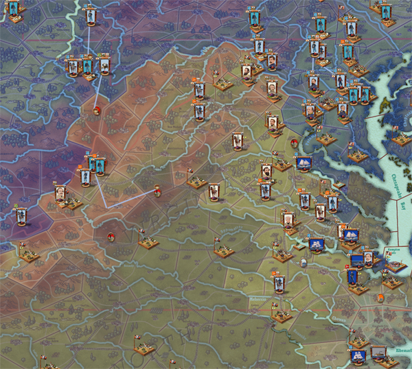 We will continue with the slow-but-sure plan for Virginia. We will get the troops trained and organized, and try to get them some decent leadership. We will form our initial lines between Alexandria and Hagerstown, with additional defenses in depth behind those lines, then push forward from Leesburg towards Front Royal and New Market, isolating any rebel forces in the Shenandoah Valley. The rebels will be forced to try to break through our entrenchments to escape. We should be on the Rappahannock and in control of most of the valley by spring. In the meantime, raids near Covington, along with an amphibious landing to take Norfolk, should divert some of the rebel troops away from the front lines.