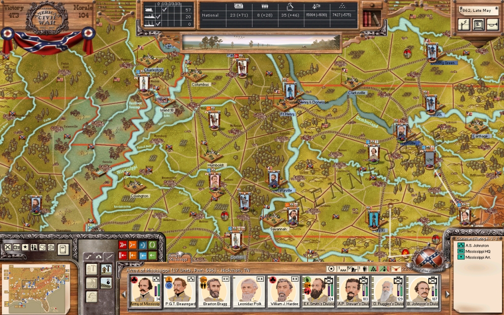 General Forrest is now outside of Humboldt and is guarding the left of Gen'rl Breckeridge's movement north. Further, I have dispatched General Buckner to Island No. 10 to take command of the troops there. We could use some larger guns to deter constant Union incursions up and down the Mississippi past the fortress.