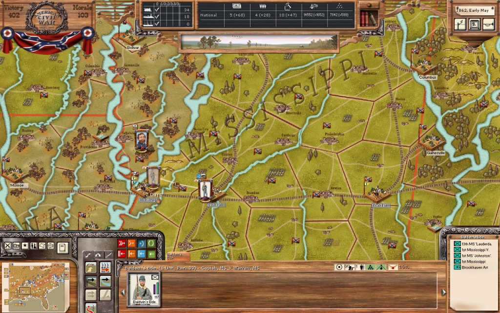 General A.S. Johnston will organize his army into three Corps as well. I Corps under General Breckenridge, II Corps under General Hardee, and III Corps under General Bragg. General Breckinridge will move North with his Corps and defend the area around Jackson, Tennessee south of Humbolt. The other two Corps, and the army HQ will move to the area around Lauderdale, Alabama, just south of Pulaski Tennessee. From this position, General Johnston should be in a position to support the attack on Nashville.