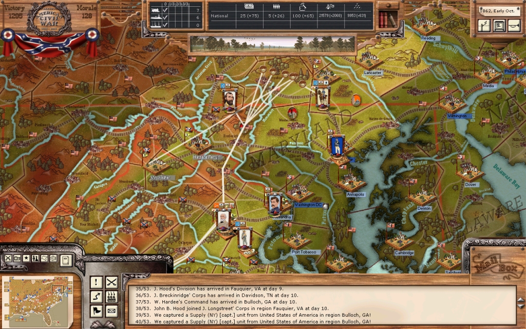 With our recent string of victories, I feel that it is now time to take this war across the Potomac and out of Virginia. Therefore, I have decided to leave the senior Corps commander, Lt. General Longstreet, here to guard the critical road to the capitol. He will have four divisions; Holmes, McLaws, Walker, and Taliaferro. The command returns show that this will be about 32,000 men.