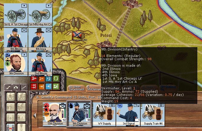 'Sherman 1' shows the view of Sherman's division when hovering over it with the pointer. His portrait is in the pop-up, but not on the division icon.