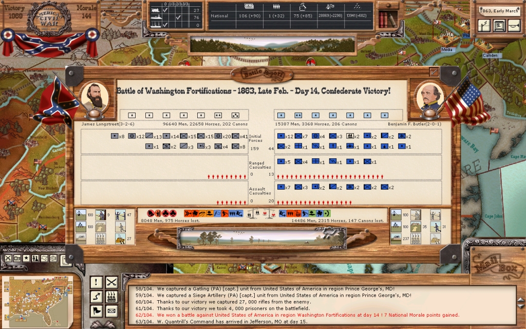 In that time, I have taken Nashville, Washington DC, and Baltimore while holding Memphis, New Orleans, Savannah, Wilmington, Richmond, Mobile, Atlanta, anc Charleston. I would call it a very successful run.