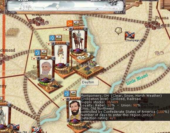 I have 100% control of Franklin, OH (containing Columbus). I only have 8% loyalty however. The 100% control allows me to move supply through Franklin to other areas (even with a low loyalty). The loyalty effects my ability to get production from this city. Also, if you look, there is a tent in the lower left of the city. This allows me to collect 1 CS point per turn as long as I have control. In the middle of the city is a supply depot (the brown square under the cannon balls). The cannon balls indicate that there is ammunition in the city (651 to be exact). Behind the cannon balls are small brown barrels indicating that there is general supply present (779 to be exact). How is this useful? Look at the attachment below. Marietta has ammo only, while Parkersburg only has general supply.