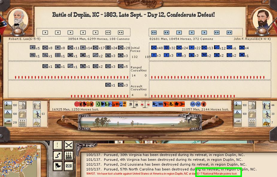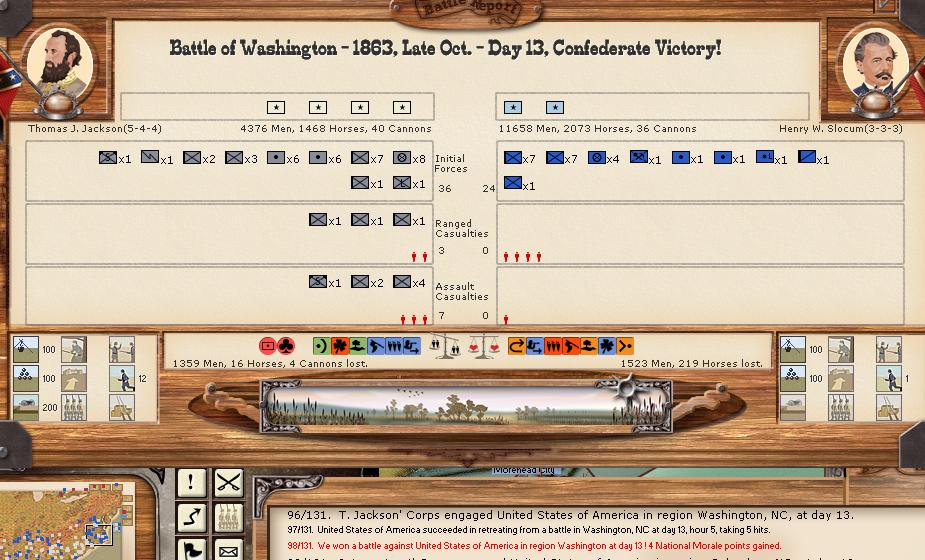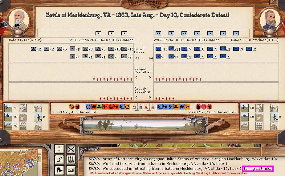 There were 3 minor and 1 major battles this turn. There were 2 minor naval battles, and Charleston harbor was able to bombard the union for 129-7 hits.
