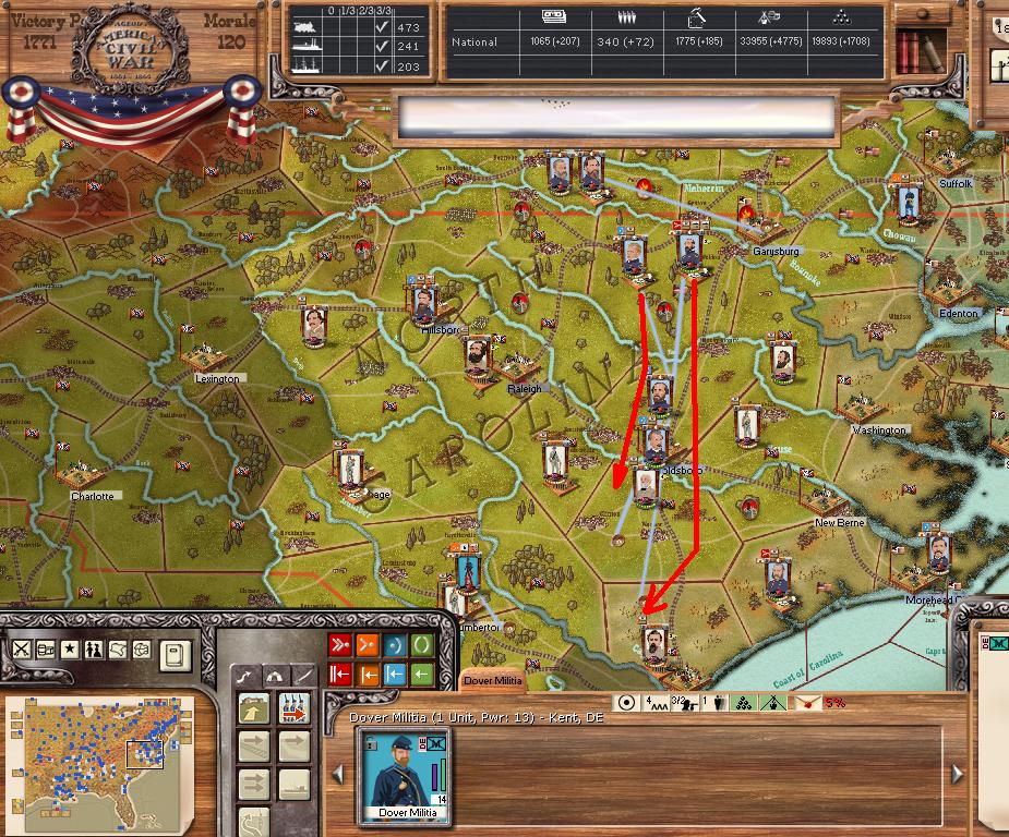 AOP attacks SW towards Florence SC (attacking through Longstreet. and Lee). AOC holds position. AOT moves east into Georgia.