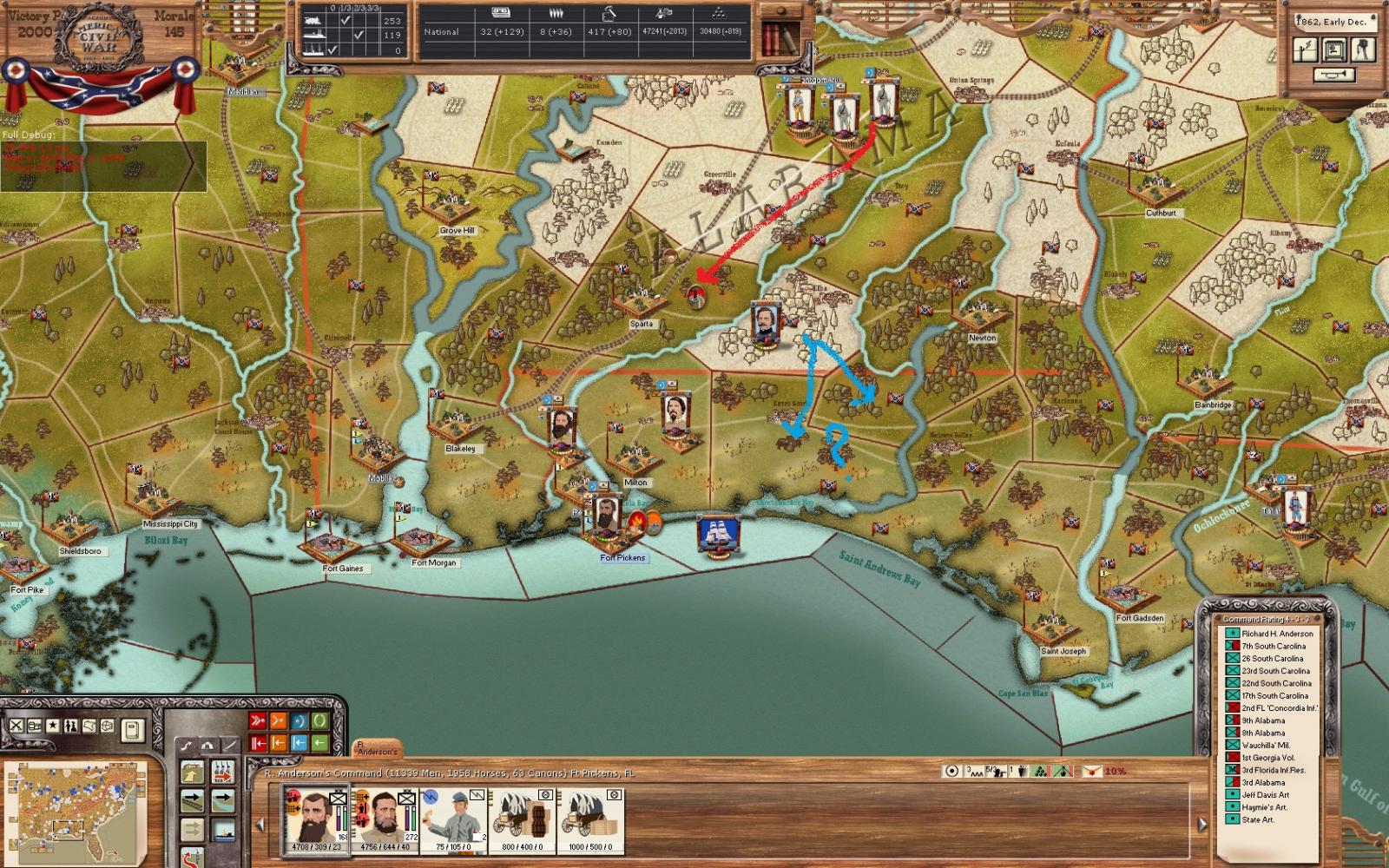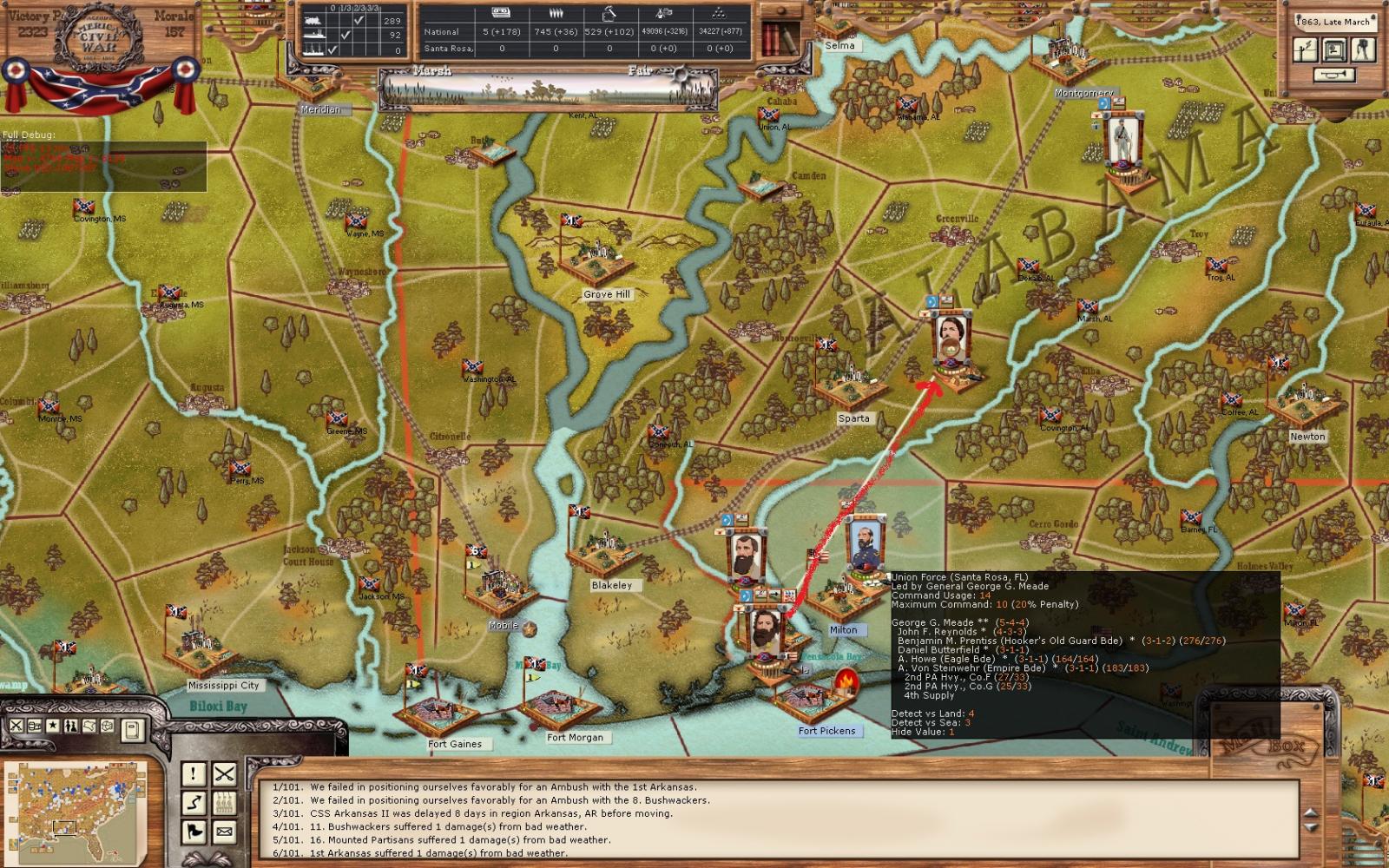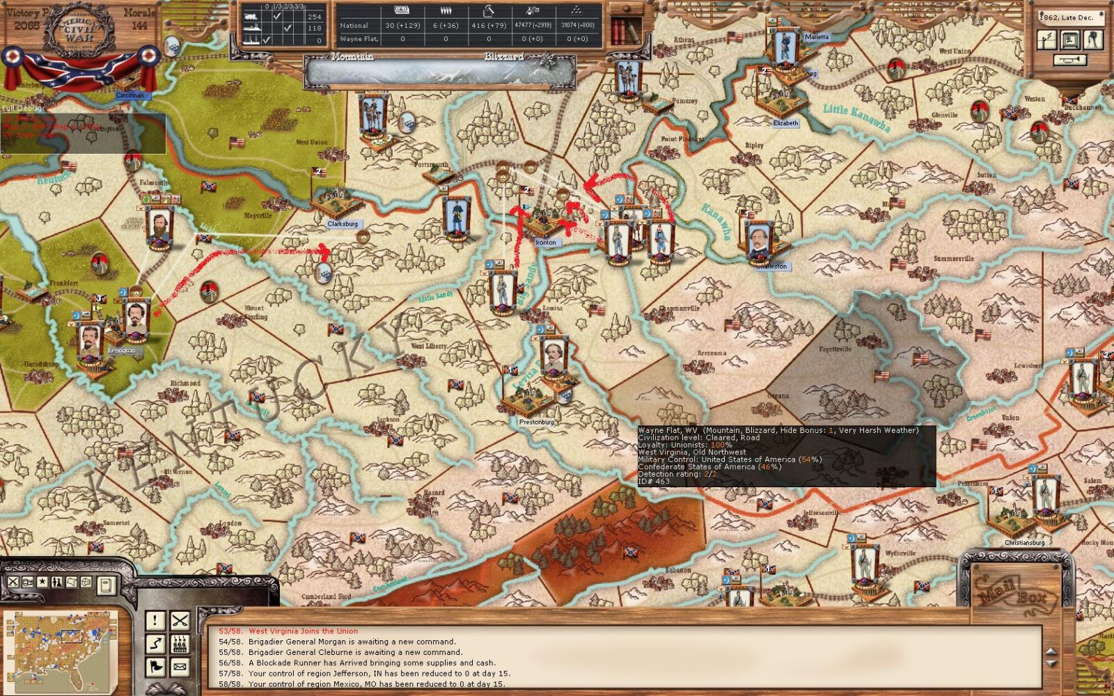 regarding your attack on Cairo, don't you fear that this will risk getting some of your forces stranded on the north side of the river if his boats prevent you from crossing back ? In that case you will lose troops in the same way he lost some... I would put the priority on stabilising that front and then either try to push him back accross the Ohio in Kentucky or Go for a big gambit an try to take St Louis an break his back in the transmississippi theater.. Anyway things are going really great...
