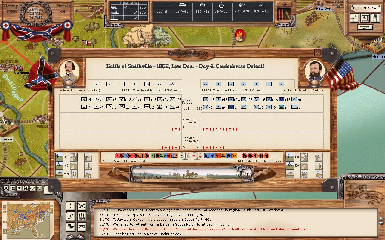 Another factor working in my favour was our recruitment and spending policies: I was more aggressive with the mobilization option. Also, my building policy was almost exclusively land oriented. Until mid 1862, my only naval investment were a few ironclads on the Mississippi. By spring 1862 Charles had naval superiority near the coasts: my brown water fleet got repeatedly trashed at the coast of NC. But Charles lacked the ressources he had spend on his navy on the land.