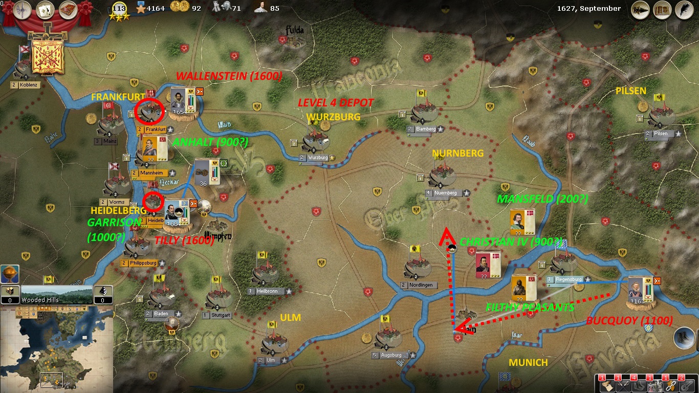 Bucquoy will stay at Prague to keep an eye on Bohemia. Aldringer will move west (via Linz due to supply issues) towards Frankfurt. Additional supply wagons will move through Pilsen to Frankfurt. If they reach Tilly in time he will move north to seize Gottingen and Kassel. The Protestants are very weak (CP 48%) but that situation will not last forever. Sweden and France are making disquieting moves towards supporting the heretics financially and perhaps even militarily. The Protestants must be crushed soon and once and for all!