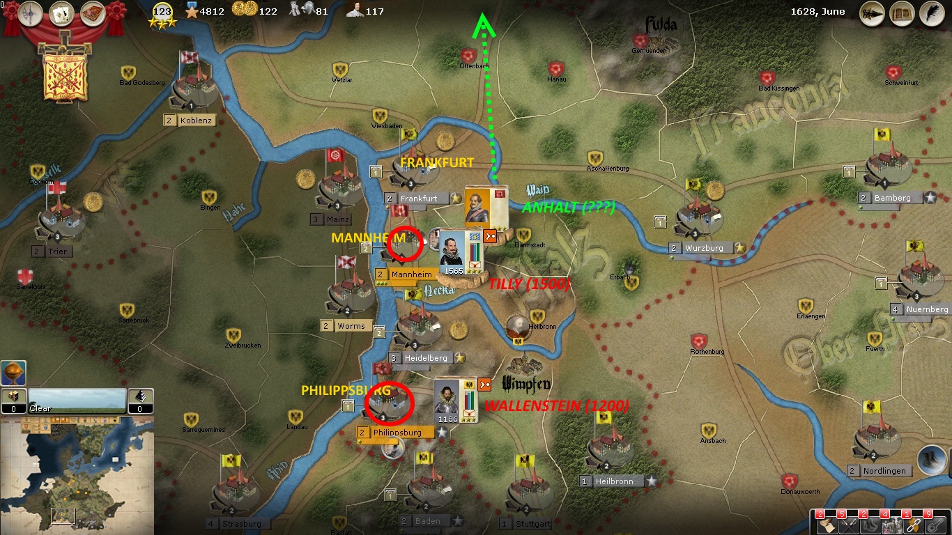 An Imperial force under Matthias Gallas (CP around 400) has been sent to assist the Spanish in Mantua. The troops appear to have come from Wallenstein's army, but he will still be able to prosecute the siege at Philippsburg, especially given the weakness of the heretics.