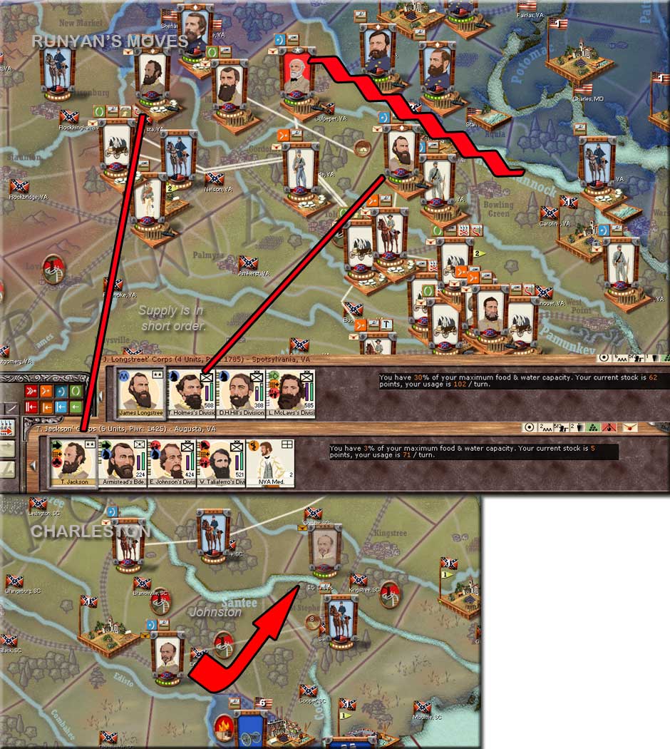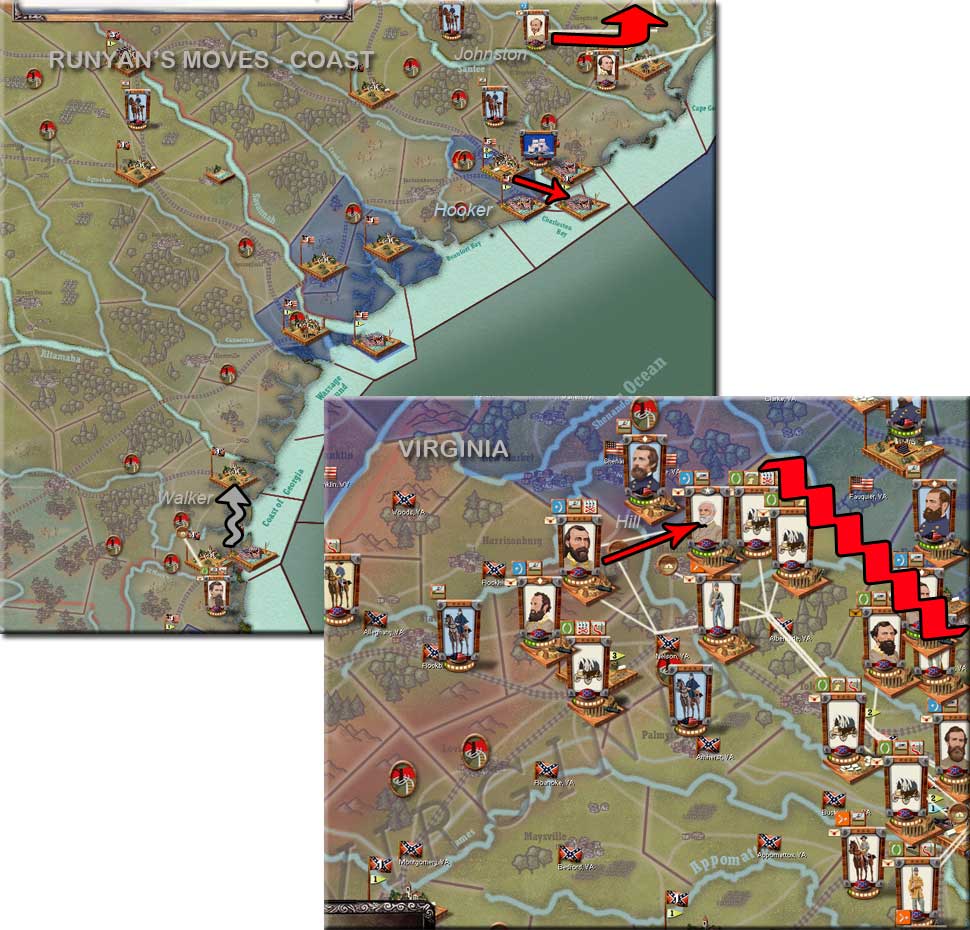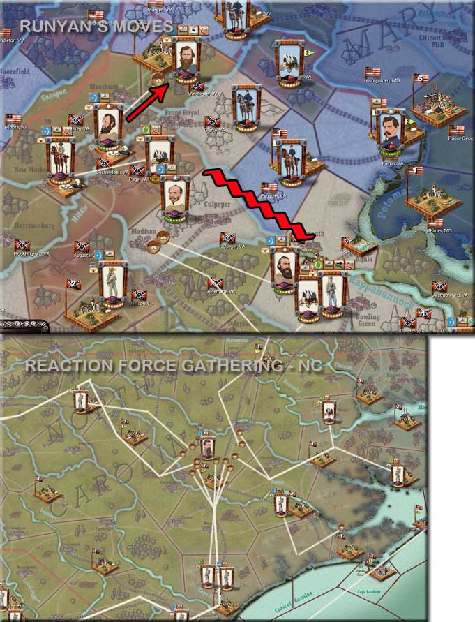 Runyan is sending Stonewall to reinforce Stuart at Winchester. He assumes a defensive posture in the other regions. He's gathering a reactionary force in North Carolina.