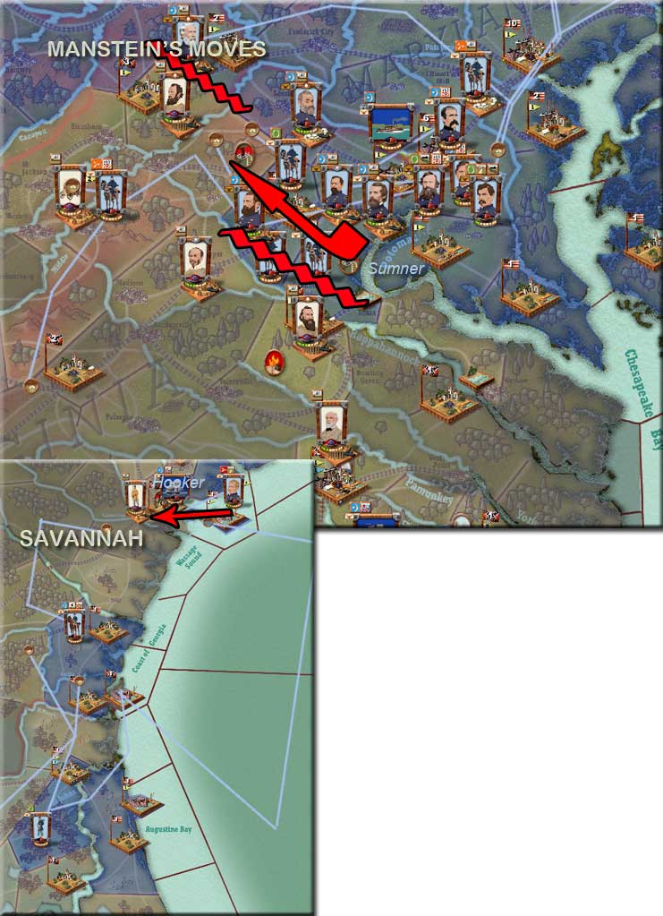 On the coast at Savannah Manstein has sent a militia element inland to wreak havoc. Jacksonville Florida, a strategic point, falls to Manstein, raising Union morale.