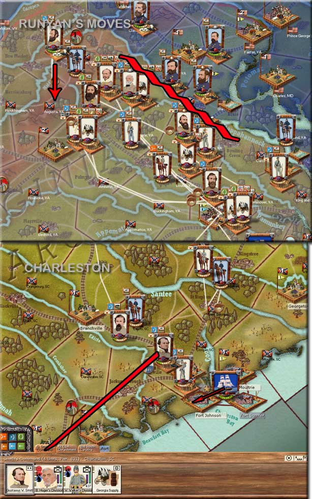 Things are heating up. Manstein is beginning to tighten the vise on Runyan. Columbus Georgia, a level four city with a depot pushing supplies forward south of Atlanta has fallen to Manstein's cav. Fort Johnson off of Charleston has fallen to Hooker. The United States Right Flank in Virginia is beginning to advance South, entering the regions vacated by Jackson.
