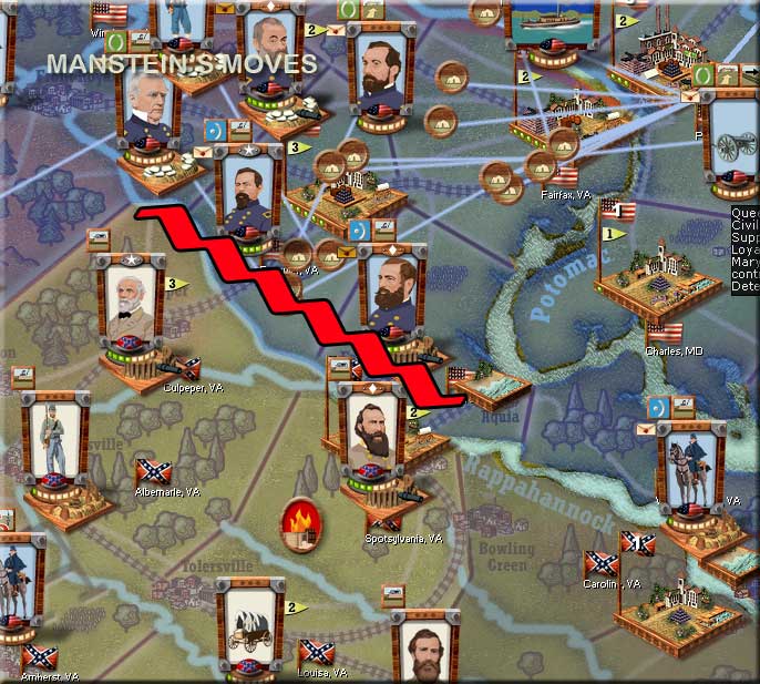 They are no major movements this turn, but Manstein is penetrating Runyan's lines and sending cav to his rear. Stuart has been dispatched to handle this problem. On the James Peninsula, Smith having escaped into Fort Monroe Magruder heads back towards Richmond.
