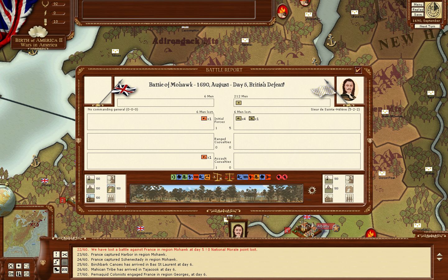 Details / explanation: Durant l'exécution du tour, une bataille survient et le rapport de combat reste affiché à l'écran sans que je puisse le fermer et le processus du tour se poursuit ainsi. Une autre bataille survient, à un bien autre lieu et entre d'autres armées, le rapport est complètement corrompu affichant en grande partie l'ancien rapport en intégrant quelques informations propres à la bataille en cours ; le processus du tour s'interrompt cette fois-ci. Problème semblable lors de la dernière bataille, le processus du tour va jusqu'à son terme sans que j'ai pu fermer le rapport de combat. Images, sauvegardes et journaux ci-joints.